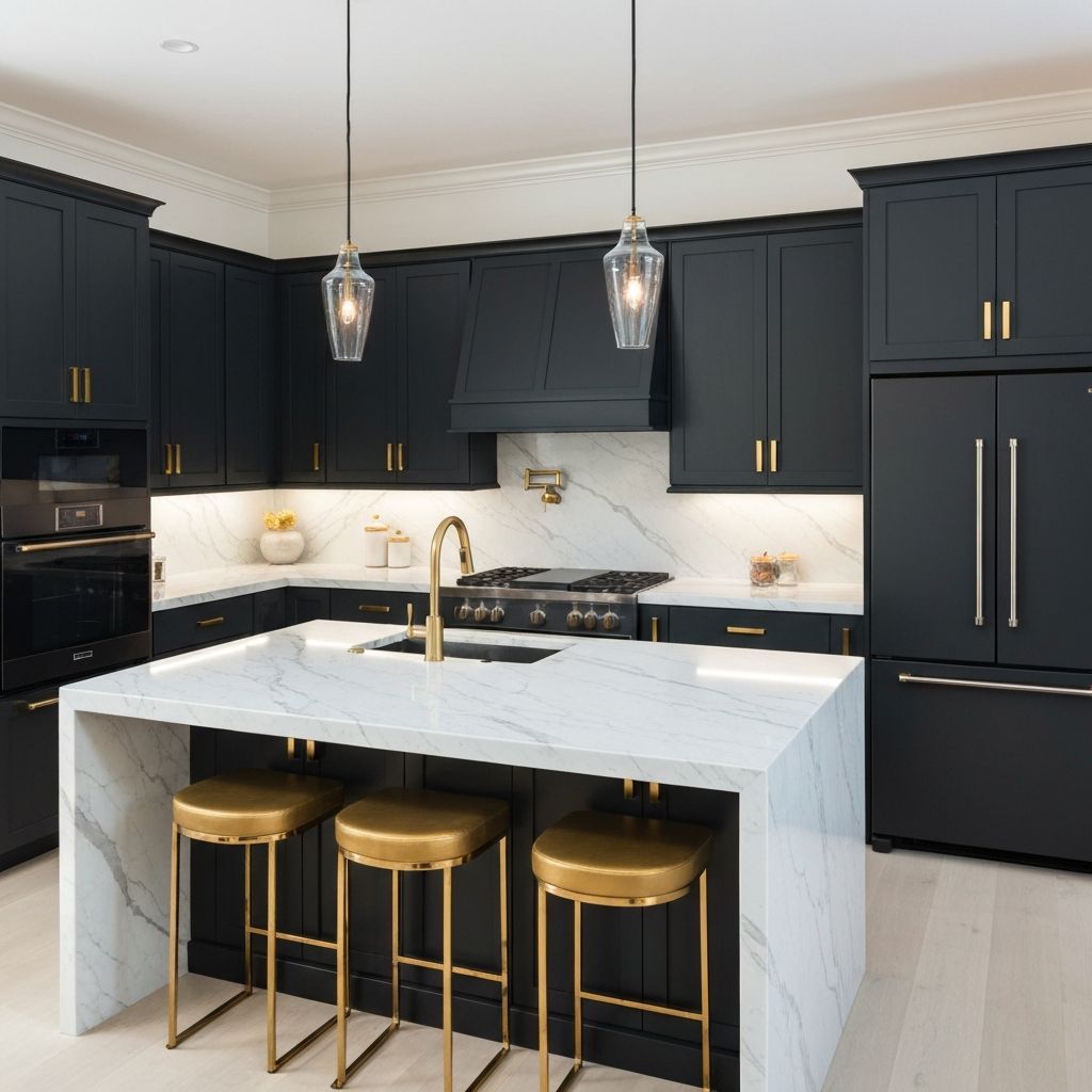 Dark charcoal flat-front cabinets, waterfall marble island, gold hardware, and black stainless appliances.