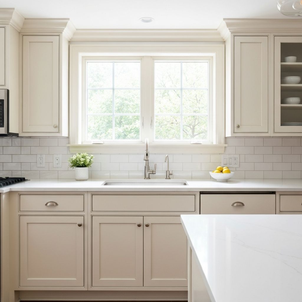 Cream cabinetry, quartz countertops, subway tile backsplash, and large picture window over the sink.