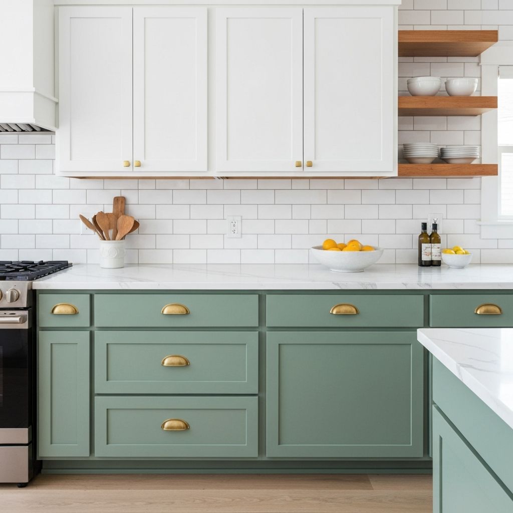 Sage green lowers with white uppers, brass hardware, white subway tile, and marble countertops.