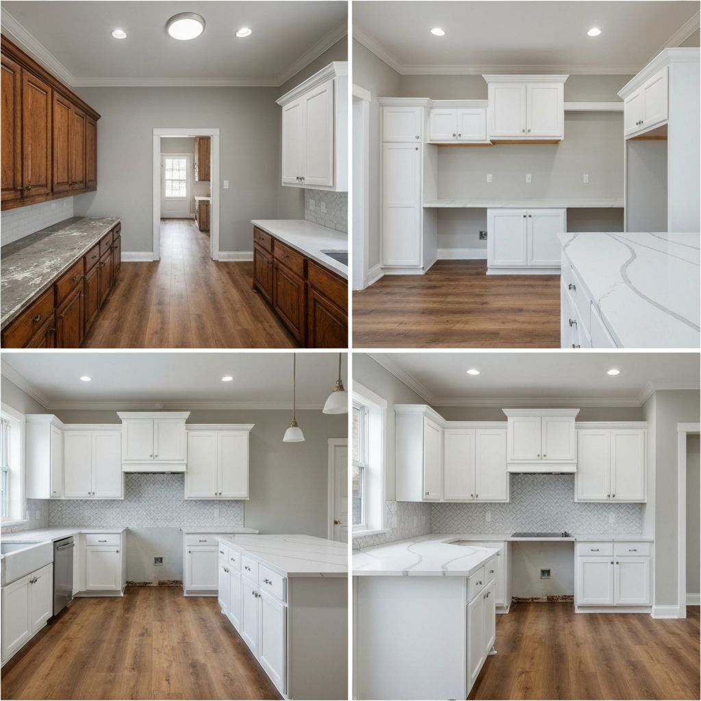 Outdated kitchen fully replaced with custom cabinets, quartz countertops, designer tile, and new flooring.