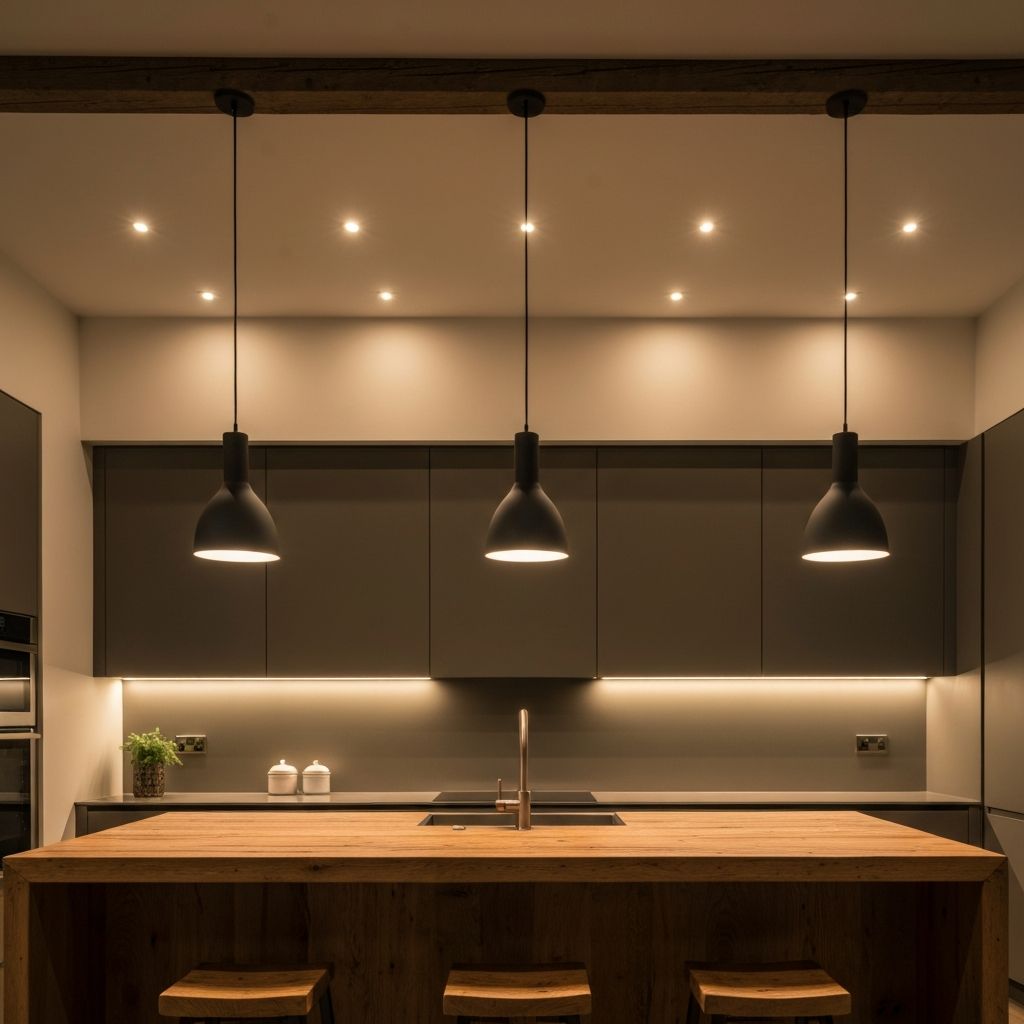 Matte black pendants over island, under-cabinet LED strips, and recessed ceiling lighting.